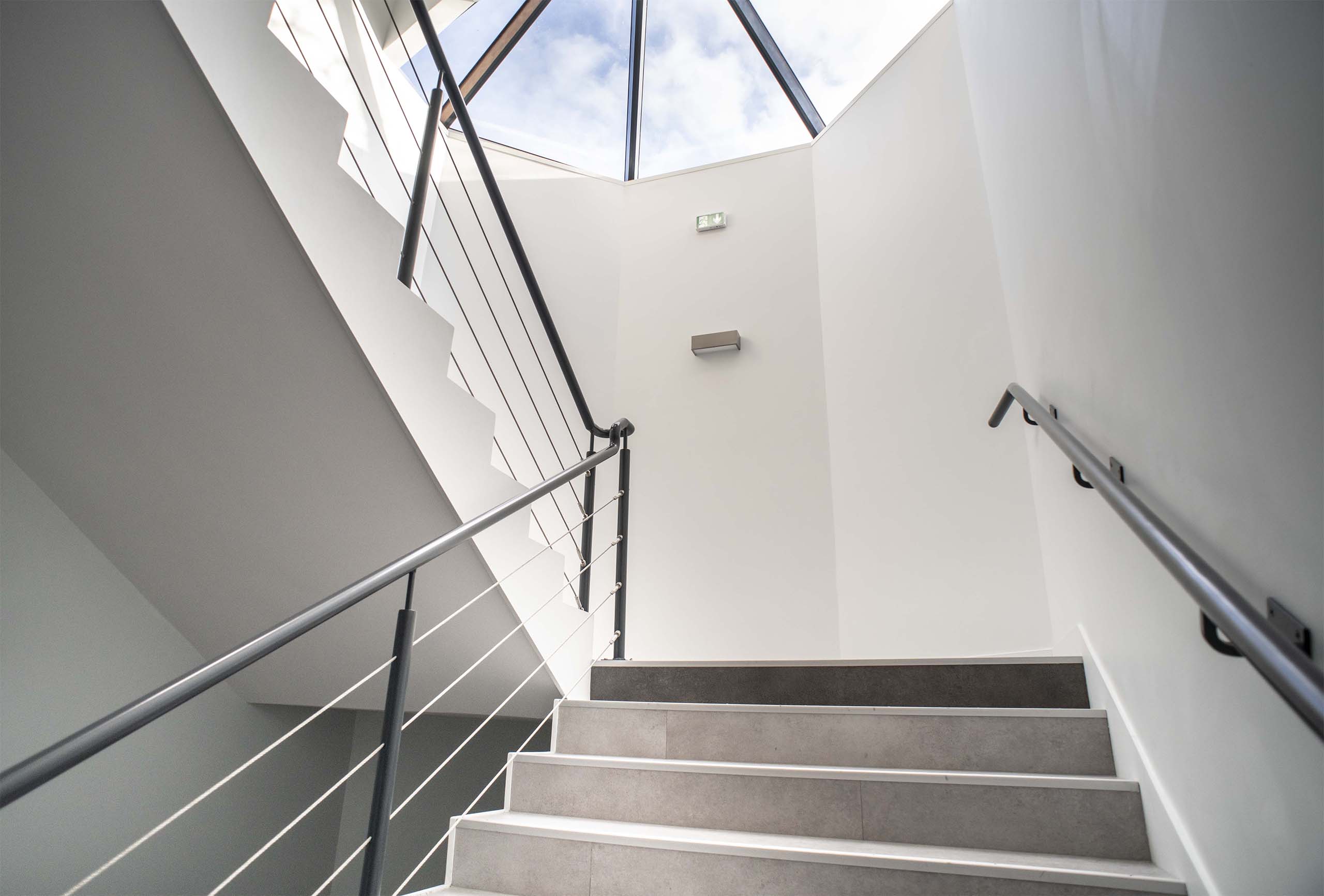 Le revêtement de sol choisi a été des dalles PVC de chez Objecflor pour les plateaux de bureaux, escalier et de dalles PVC type moods, pose hexagonale, pour l’espace de vie au RDC.